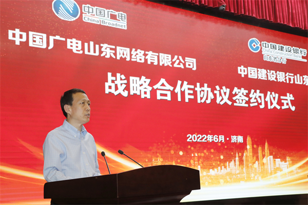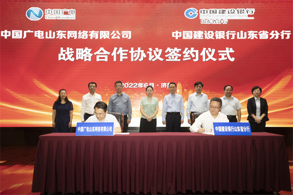本网讯 6月17日下午,公司与中国建设银行山东省分行战略合作协议签署仪式在济南举行。双方将以此次签约为新起点,更加紧密地建立以平等为基础,以诚信为纽带,以互助为抓手,以共赢为目标的长期伙伴关系,充分发挥各自资源优势,全面加强在“文化+金融”、智慧城市(社区)、信息化建设、广电5G、虚拟电视台建设等领域的合作交流,助力新时代社会主义现代化强省建设。公司党委书记、董事长李建华,中国建设银行山东省分行党委书记、行长杨军出席仪式并致辞。公司副总经理孙柏出席仪式,中国建设银行山东省分行副行长刘春龙主持签约,公司总会计师尹志波与中国建设银行山东省分行副行长董强代表双方签署战略合作协议。